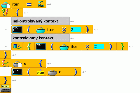 } |  | | Try (For modes 2D, 3D, Console) |  Zobrazit příkladSkrýt příklad | | Do bloku try uzavřeme potenciálně nebezpečné příkazy, jež by mohly vyvolat výjimku v běhu programu. | | V bloku try spustí audio soubor text.mp3. Pokud při jeho spouštění nastala nějaká výjimka (např. soubor neexistuje), uloží do proměnné s hodnotu false. Ať už byl soubor spuštěn, nebo ne vypíše obsah proměnné s. | | |